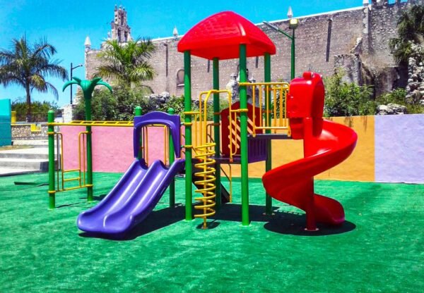 Juego infantil con estructura metálica de acero galvanizado, recubrimiento en polvo y plástico de rotomoldeo. Medidas: 6.00 x 4.00 x 3.60 mts. Edades: 3 a 9 años. Área mínima: 8:00 x 6:00 mts. Línea midplay.